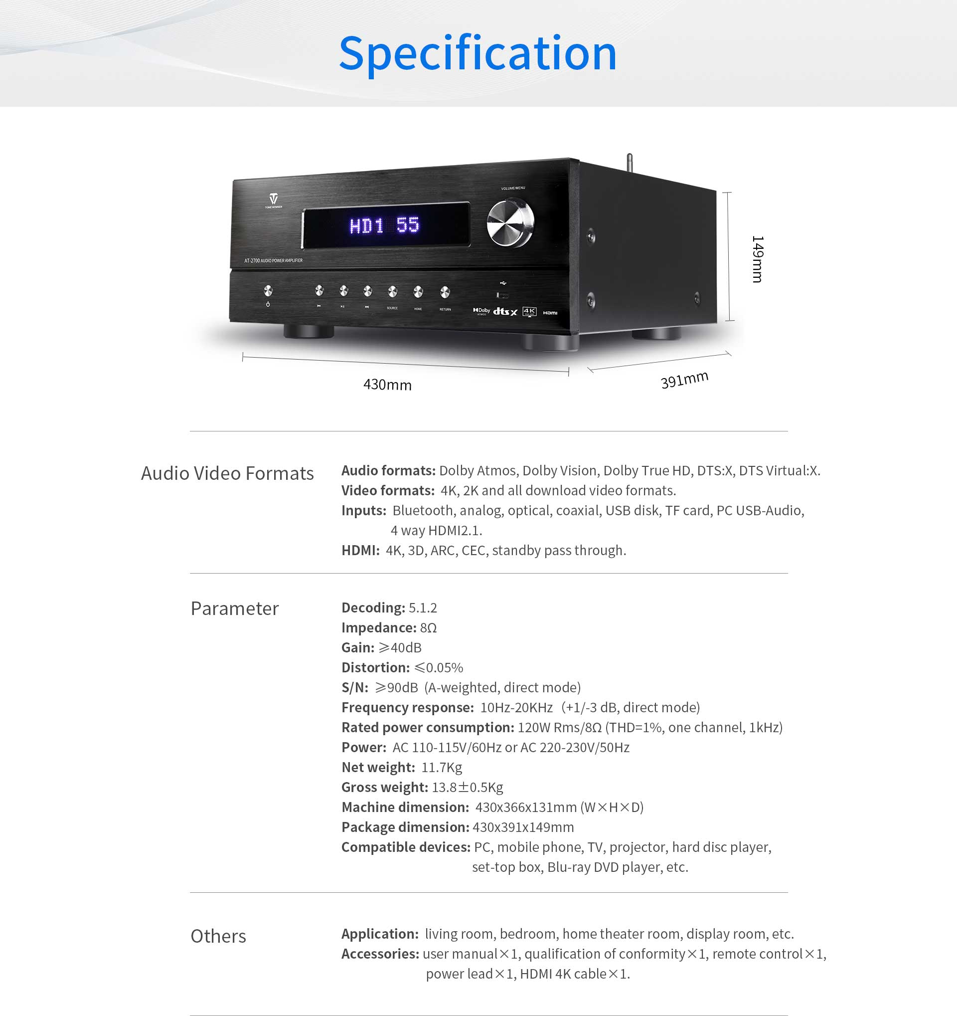El AT-2700 es un amplificador integrado para receptor AV compatible con Dolby Atmos, DTS:X, 4K, Dolby Vision, HDR, etc. También admite decodificación 5.1.2, Bluetooth, HDMI 4 entradas y 2 salidas, control CEC, menú OSD, RS232, control mediante app para móvil, etc. Como una de las 10 principales marcas de audio de China, Tonewinner cuenta con más de 30 años de experiencia en el diseño y la fabricación de productos acústicos. Como proveedor original, Tonewinner siempre da una cálida bienvenida a distribuidores, socios y clientes de todo el mundo.
