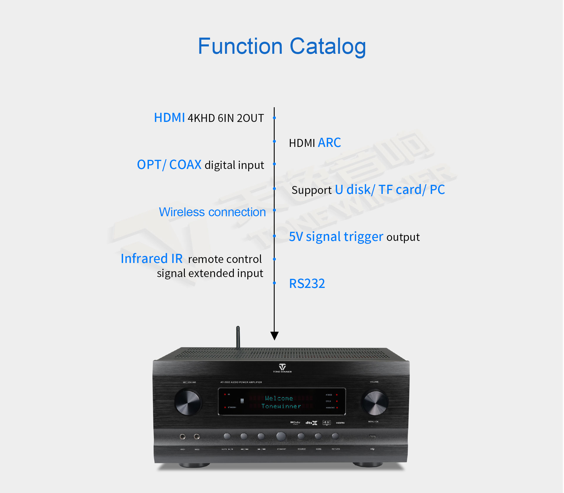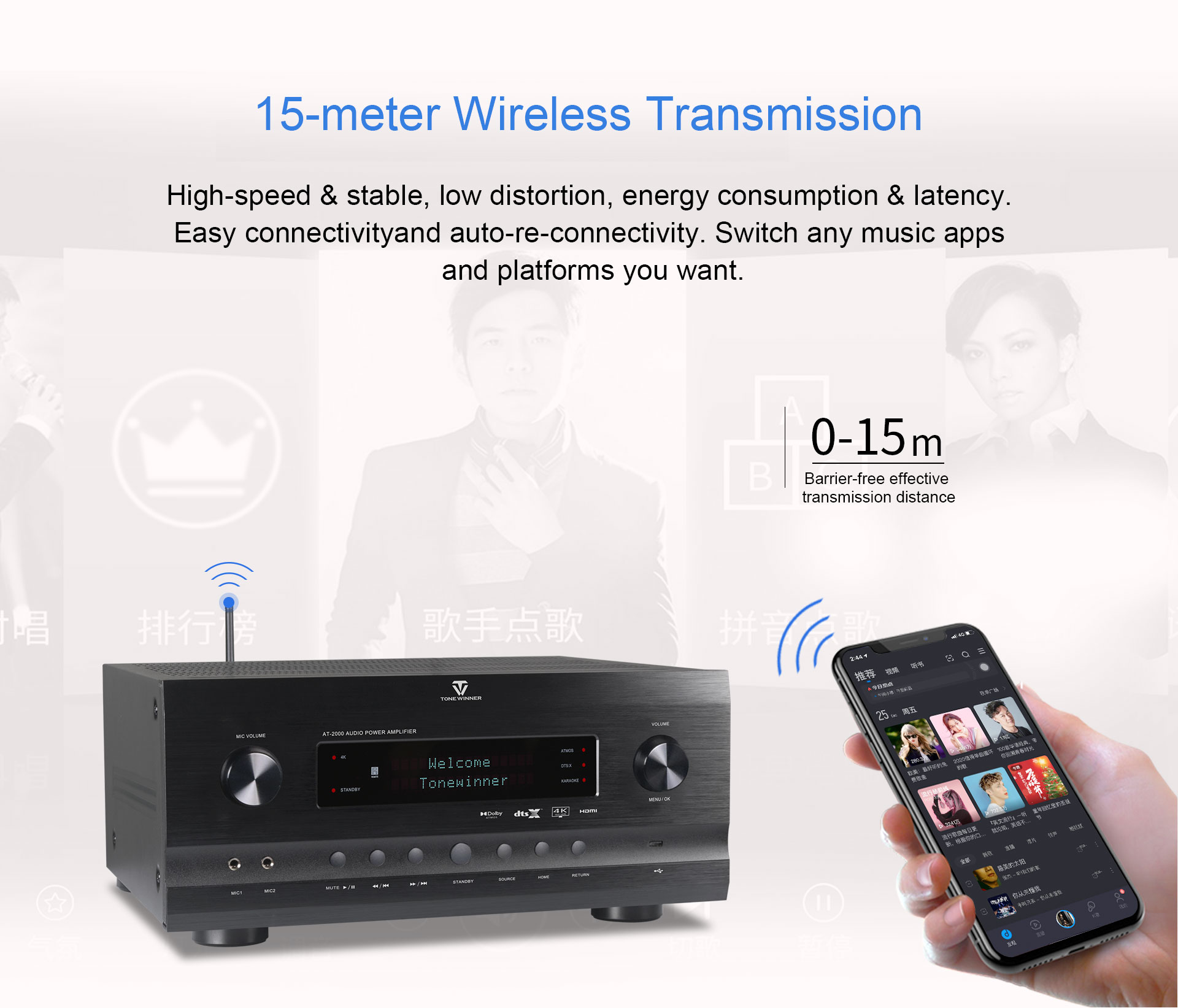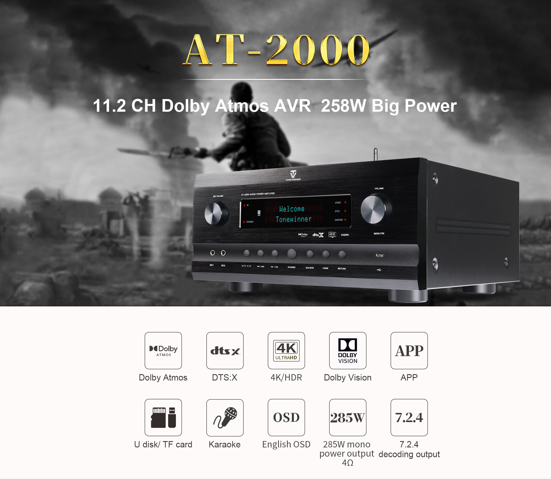 El AT-2000 es un amplificador integrado de alta gama para cine en casa y karaoke. Admite Dolby Atmos y DTS:X y es retrocompatible con todas las versiones anteriores de estos formatos de sonido. Admite 4K, 3D, HDR, Dolby Vision, reproducción de audio ARC, control de micrófono mediante aplicación, disco USB, tarjeta TF y diversos formatos de audio comprimido y sin pérdidas. Se puede configurar como un sistema 7.2.4 para una experiencia de karaoke inmersiva.