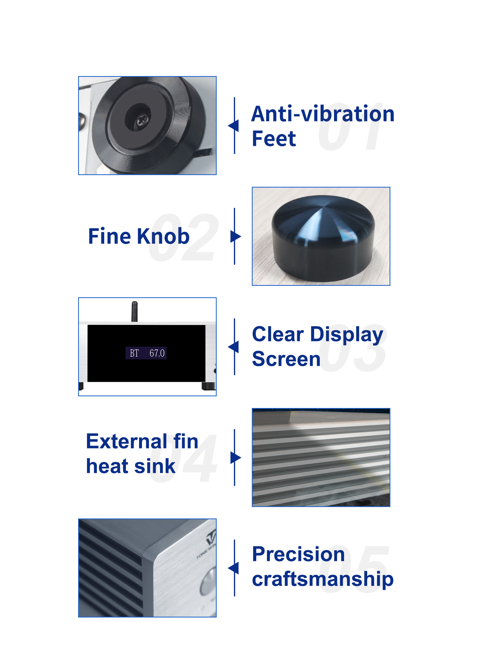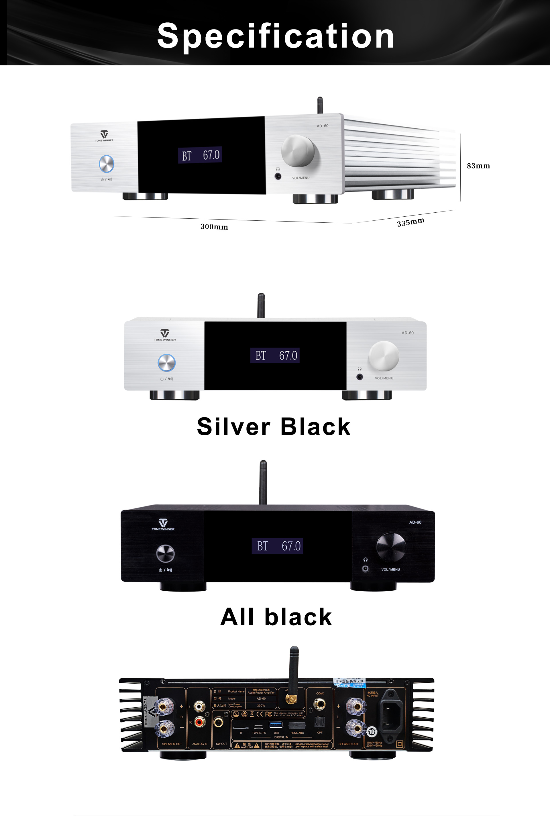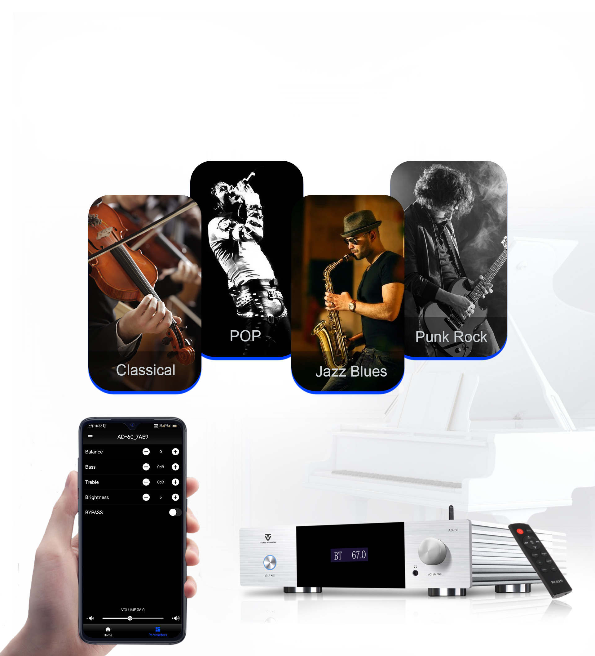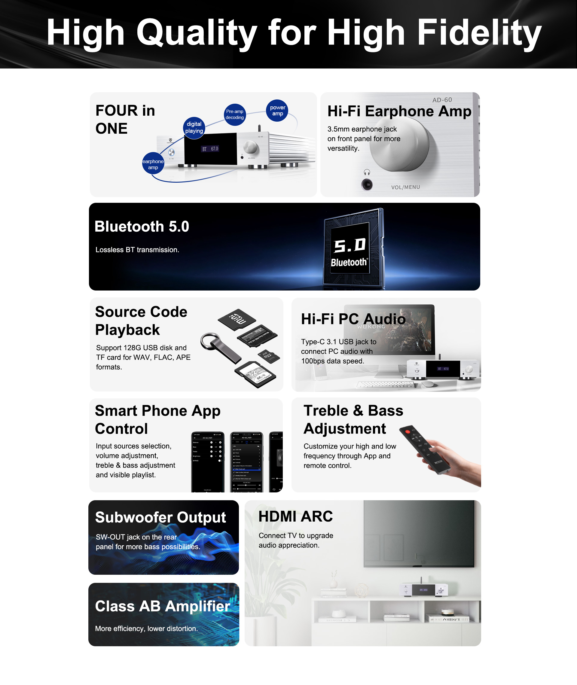 El AD-60 es un amplificador de potencia integrado de clase AB compatible con sistemas 2.1. Combina decodificación de preamplificador, amplificador de potencia, reproducción digital y amplificador de auriculares. Es compatible con Bluetooth 5.0, memorias USB, tarjetas TF, control mediante app para smartphones y entradas digitales, incluyendo óptica, coaxial y USB-Audio para PC. Su diseño y fabricación originales con materiales y componentes de calidad ofrecen un sonido analítico. Es un amplificador de potencia moderno y económico para disfrutar de un sonido de alta fidelidad.