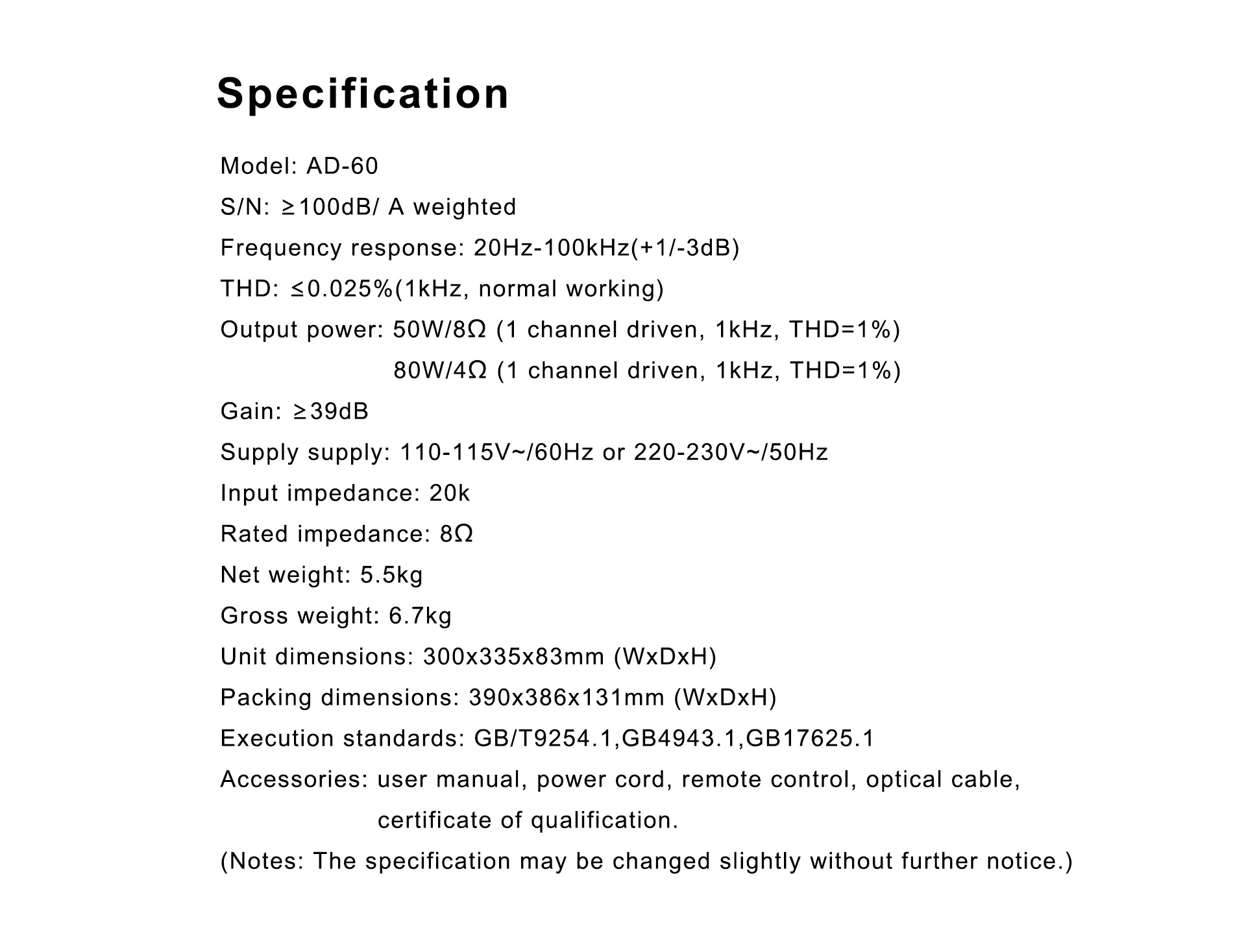Modelo | 60 d. C. | Distorsión armónica total | ≤0,025 % (1 KHz, funcionamiento normal) |