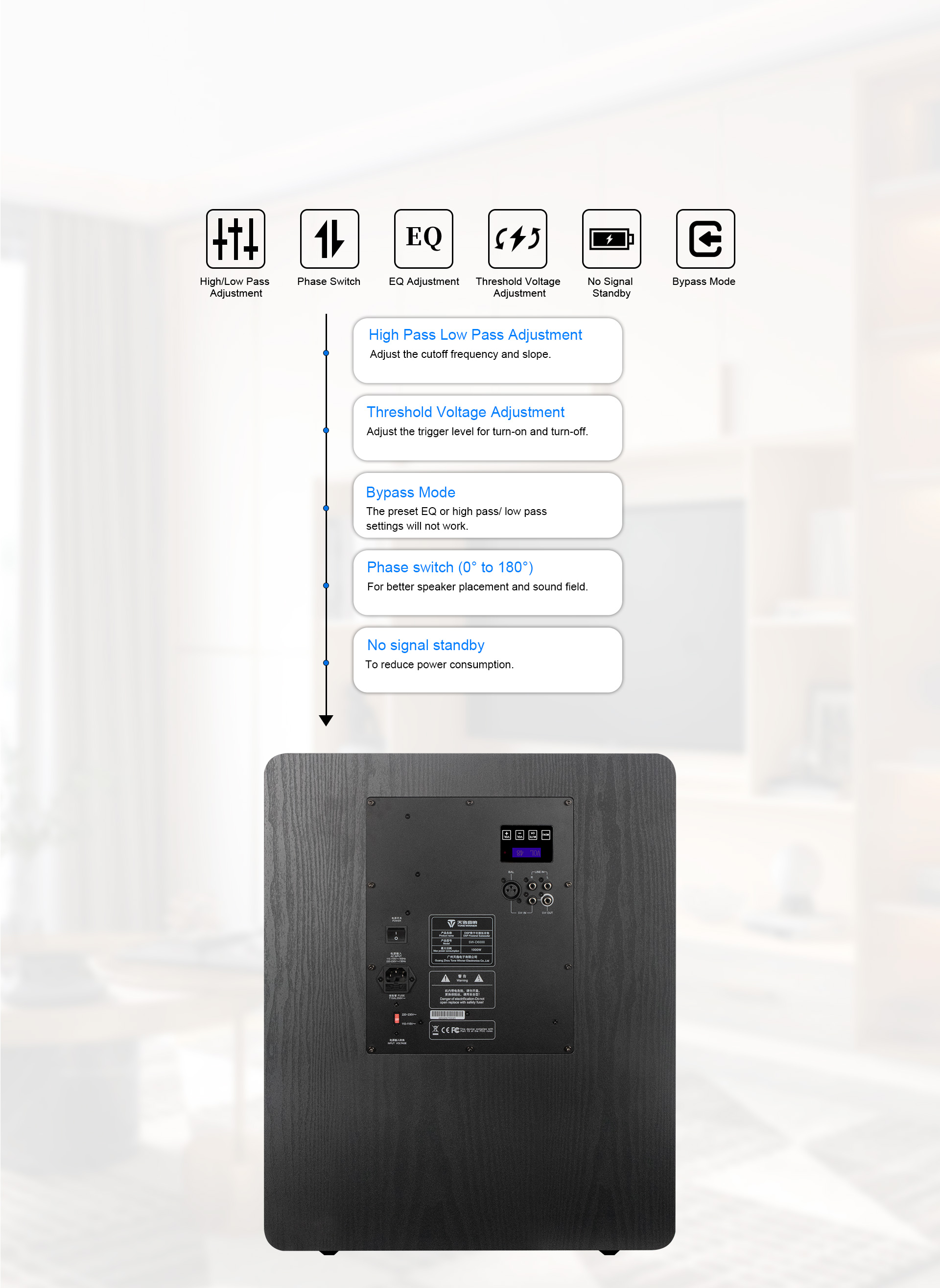 Procesamiento digital DSP, pantalla LCD, botones táctiles, control de aplicación, actualización inalámbrica, ajuste de ecualizador, ajuste de rango de frecuencia, conmutación de fase 0°/180°, entrada balanceada, ahorro automático de energía sin señal.