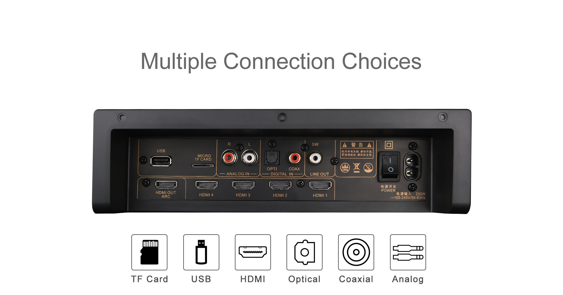 HDMI2 de 4 vías. 1 , 1 vía USB, 1 vía tarjeta TF, 1 vía óptica, 1 vía coaxial, 1 vía cosa análoga. |