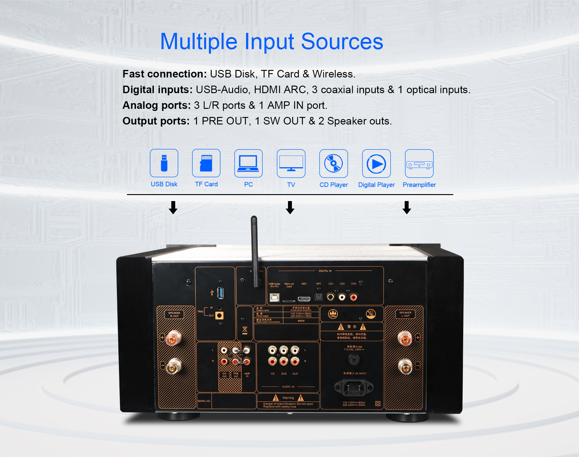 El AD-99D es un amplificador integrado Hi-Fi Clase A especial compatible con discos USB de 128 GB, tarjetas TF y formatos de audio sin pérdidas como WAV, FLAC, APE, etc. También admite ajuste independiente de agudos y graves, salida de subwoofer y control mediante la aplicación original. Como proveedor original, Tonewinner da una cálida bienvenida a distribuidores, socios y clientes de todo el mundo.
