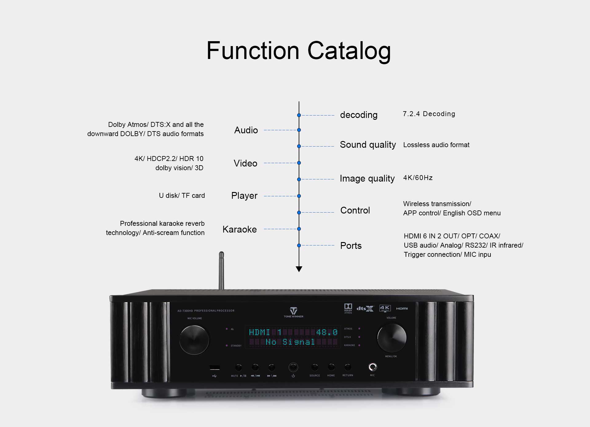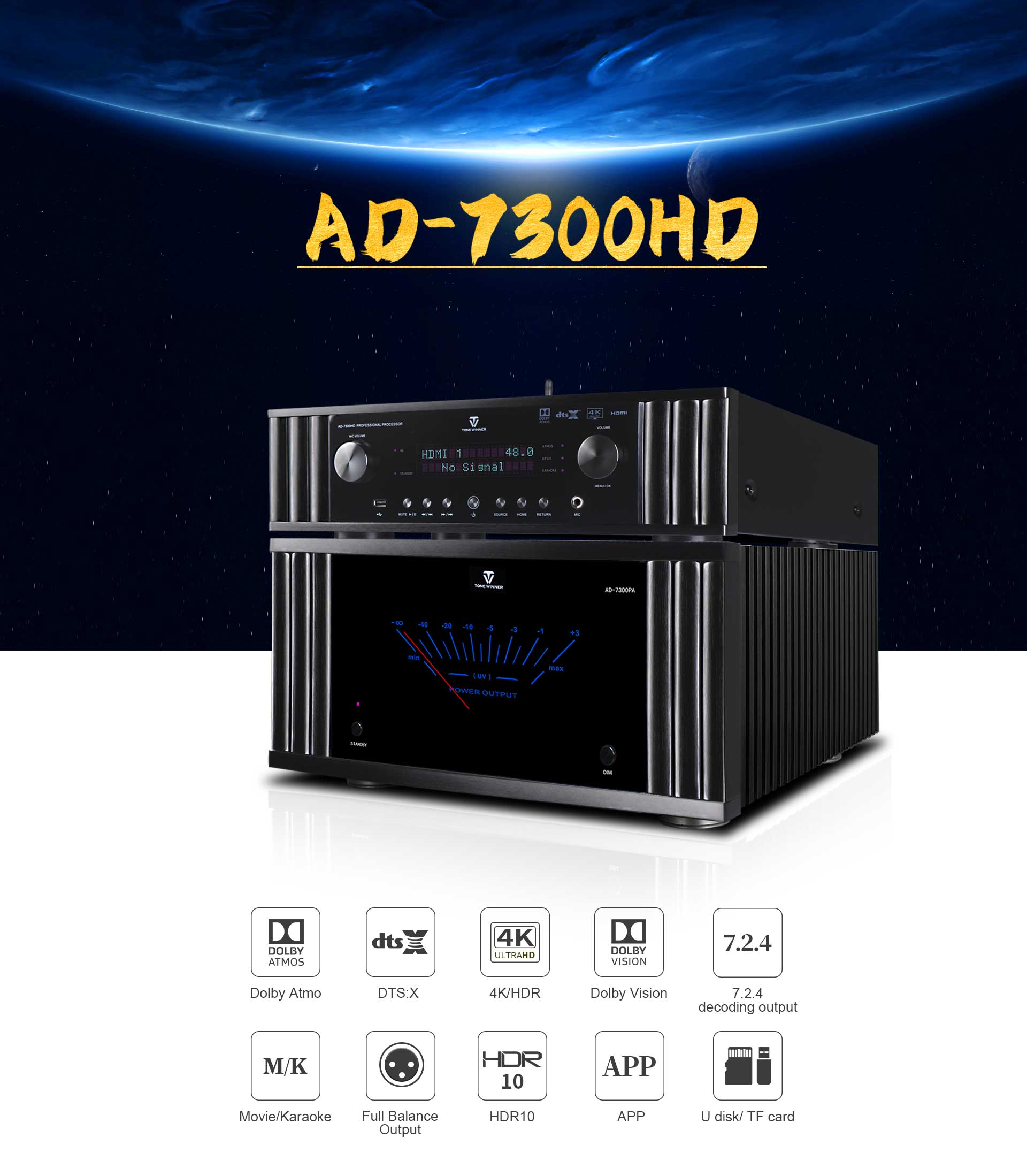 El AD-7300HD es un procesador de audio y vídeo integrado para música, cine y karaoke. Es compatible con Dolby Atmos, DTS:X y decodificación 4K, además de 3D, HDR, Dolby Vision, etc. Admite menú de capas OSD, subgrupo de matriz y calibración automática del ecualizador. También es compatible con control por aplicación, disco USB y tarjeta TF. Como decodificador multifuncional, es ideal para el entretenimiento en casa con un efecto de sonido envolvente.